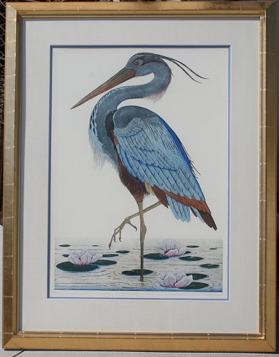 MITRA, Dan, (American, 20th C.): Blue Heron, Colored Engraving, sight size 32 1/2'' x 23'', signed, numbered 419/750, fine gilded contemporary frame, 46'' x 36''. Before coming the United States from Romania, Dan Mitra worked as a graphic designer for both theatre and cinema. After moving to the United States, Mitra began experimenting with etching.