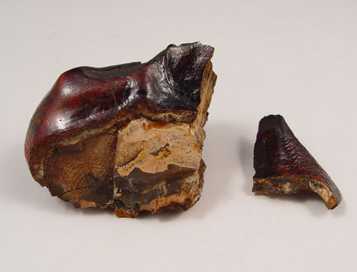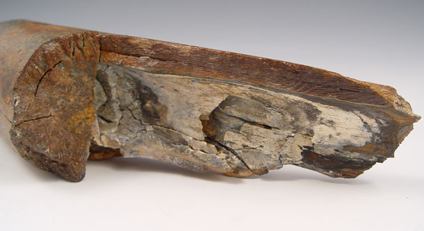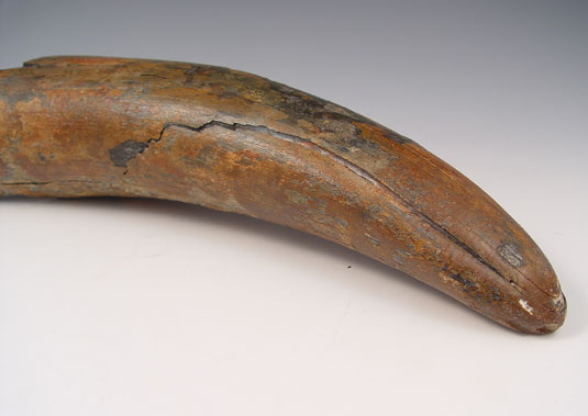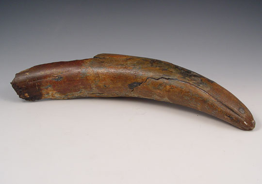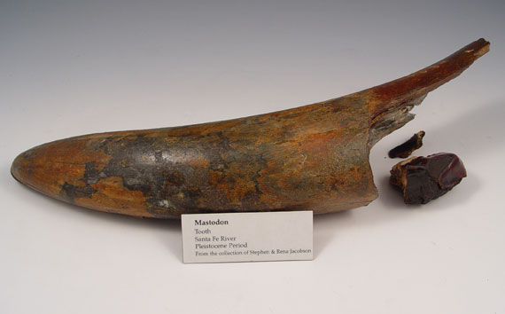MASTODON PARTIAL TUSK & TOOTH: Pleistocene period, Sante Fe River area. Includes 1) Partial tusk, deep age color, age cracks. Measures 18'' long overall. 2) Tooth, in 2 pieces, deep age color, measures 3'' high overall. Comes with original museum plaque.