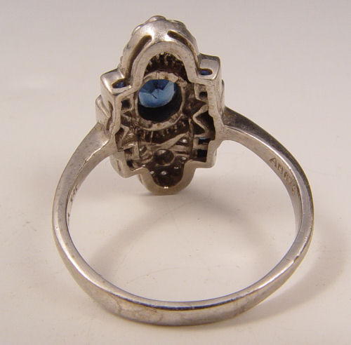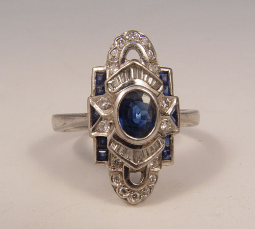 DECO STYLE 18K DIAMOND & SAPPHIRE RING: 18K white gold ring contains one oval cut sapphire, 8 square calibre cut sapphires and 2 triangle cut sapphires. Weight: 1.50 Ct. Approx. The sapphires average VS in clarity (Type II), B - slgB in hue, 7 in Tone and 3 in Saturation. There are 18 round full cut diamonds and 20 tapered baguette cut diamonds. Weight: .50 Ct. Approx. The diamonds average VS in clarity and G-H in color. The sapphires are bezel and channel set. The diamonds are bead and channel set. Weight: 7.6 grams. Size: 9.25