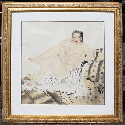 CONTEMPORARY RECLINING JAPANESE FEMALE NUDE: Watercolor, sight size 25'' x 25'', signed lower left, encased in embossed gilded gesso frame with minor wear, 37'' x 37''.
