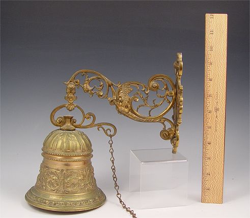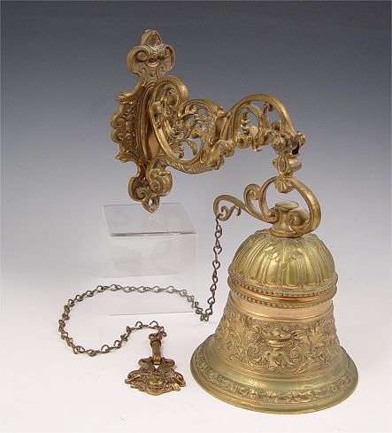 EUROPEAN CAST BRONZE BELL: 19th C. bell with chain pull. Overall measures 10'' high x 10'' deep. Bell measures 4 1/2'' high x 5 14'' dia.