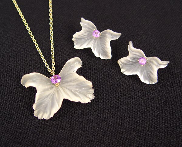 14K CARVED CRYSTAL & AMETHYST NECKLACE AND EARRINGS SUITE: 14K yellow gold earrings and necklace contains three 4.00 - 5.00 mm round mixed cut amethysts. Three carved pieces of rock crystal depict orchids. The earring crystal measures approx. 7/8'' and the necklace crystal measures approx. 1 1/4'' in width. Post and nut on earrings. Necklace is attached to a 14K yellow gold 20'' anchor link chain. Approx. weight: 3.5 grams.