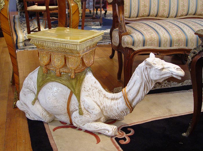 WHITE CAMEL CERAMIC GARDEN SEAT: Unusual form in a garden seat, the faience glaze white camel, 18''h.x 34'' long.