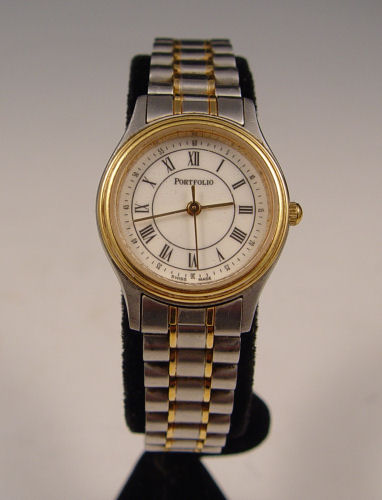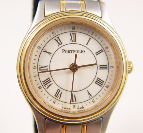 TIFFANY & CO LADIES PORTFOLIO WATCH: Ladies gold filled and stainless wristwatch. Good running order.