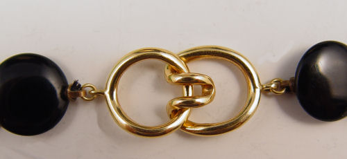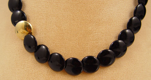 TIFFANY & CO. ONYX AND 18K GOLD DISK NECKLACE: Strand of disc shaped onyx beads with 18K accent bead and clasp. Signed on the clasp. 16'' long.