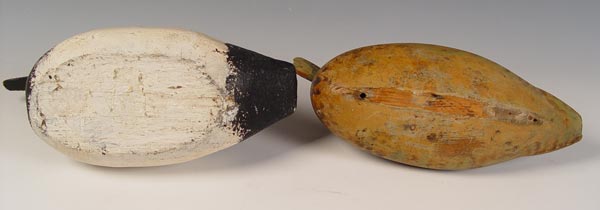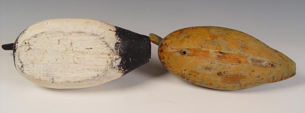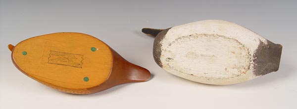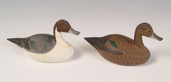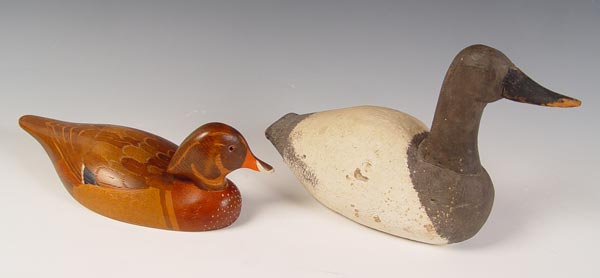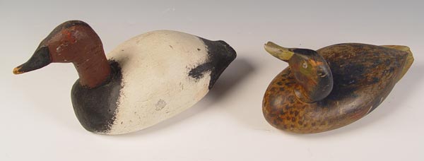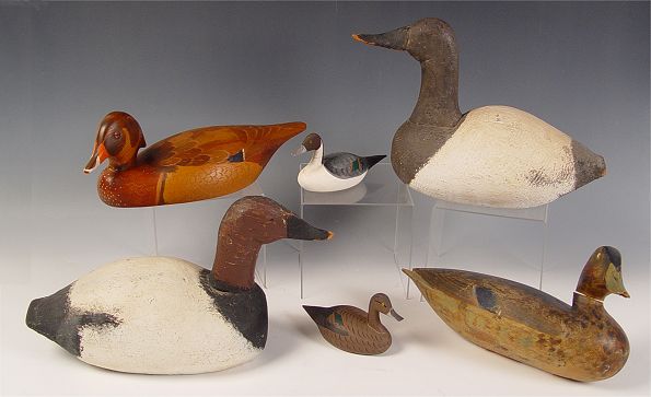 6 VINTAGE DUCK DECOYS AND MINIATURES: To include 1) Unsigned and unknown region male & female Merganser working decoys, chipped paint, painted eyes on one. No hardware, note condition. Larger measures 9 1/2'' high x 14 1/2'' (323). 2) Unsigned mallard, working decoy, missing glass eyes, no hardware, note overall condition especially neck, chips. Measures 7'' high x 14 1/2'' (321). 3) Illegible stamped Westwood Mass decorative wood duck, glass eyes. Measures 5'' x 14 1/2''. (324) 4) 2 miniature decorative ducks signed Capt. Jessie Wire, Rock Hall Md. Note overall condition, necks. Measures 3 3/8'' high x 6 1/2'' (322).