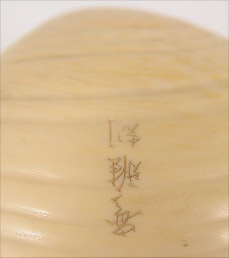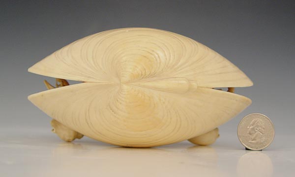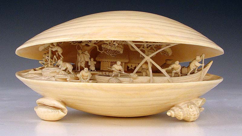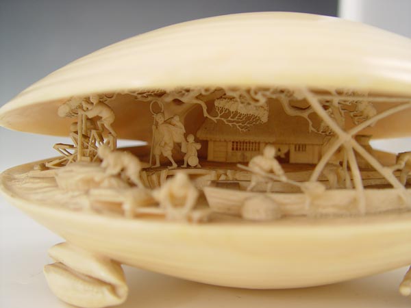 SIGNED CHINESE CARVED IVORY CLAM SHELL WITH INTERIOR SCENE: Detailed fishing village interior scene inside clam shell design. On 2 shell form feet. Signed in characters on base. Measures 3'' high x 6'' x 4 1/4''.