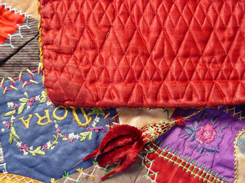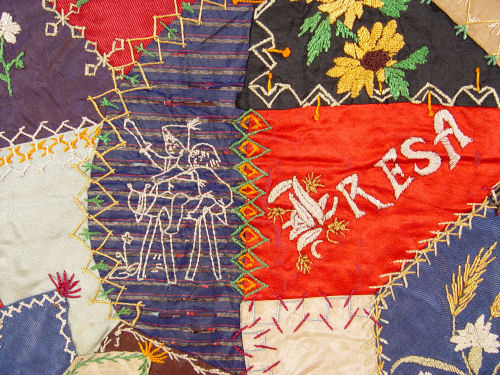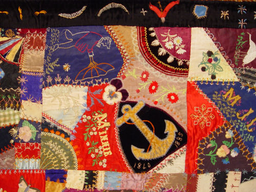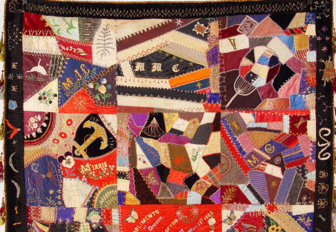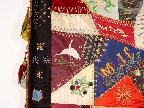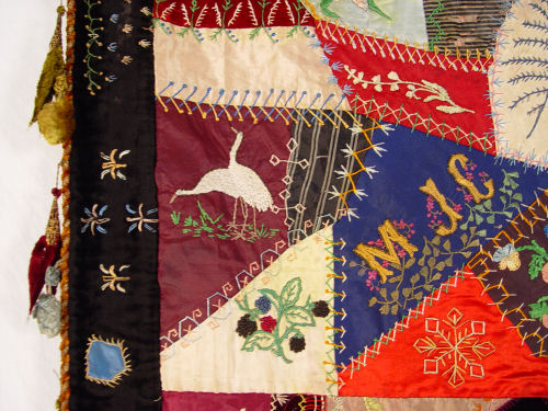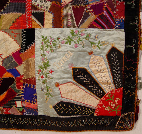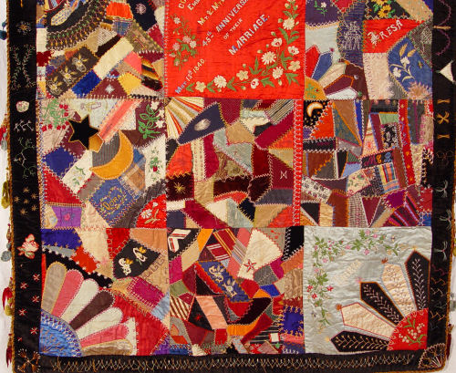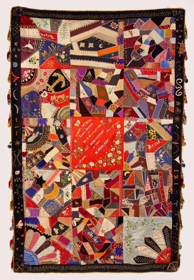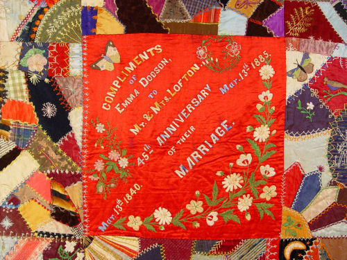 EXTRAORDINARY CRAZY QUILT DATED 1885 BY EMMA DOBSON: 15 squares, each with embroidered name or initials along whimsical embroideries of anchors, moon, stars, children, fauna. Every time we look we find a new image. The center square ''Compliments of Emma Dobson To Mr. & Mrs. Lofton 45th Anniversary of Their Marriage Mar 13 1840 - Mar 13 1885''. There are only approx. 3 pieces of silk that are worn. Black velvet border with embroidery. The back is machine stitched in a very elaborate diamond pattern, believed to be silk, and has minimal wear. Fringe on the sides, sewn dowel pocket for wall display. 50'' x 77''.