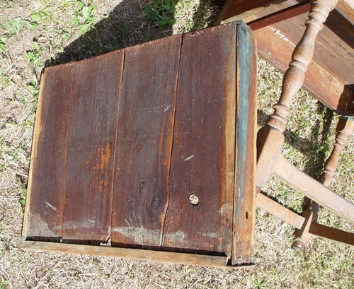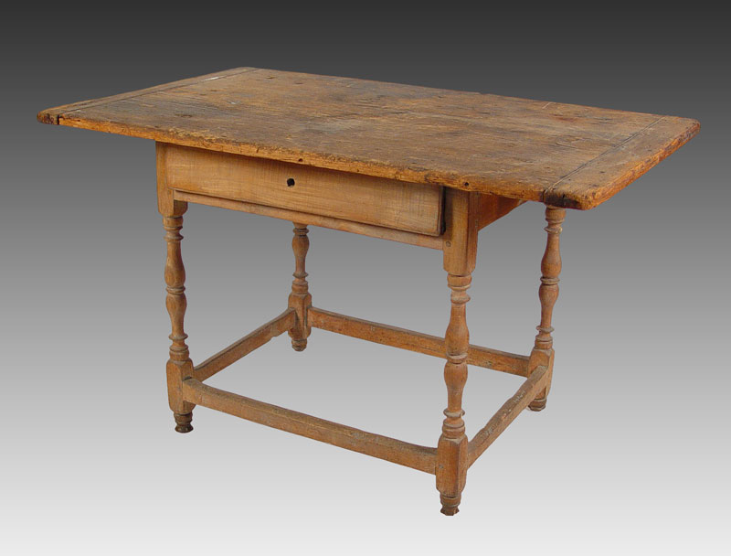 EARLY TAVERN TABLE: Breadboard ends, full length drawer. Measures 25 1/4'' high x 42 1/2'' x 23 3/4''.