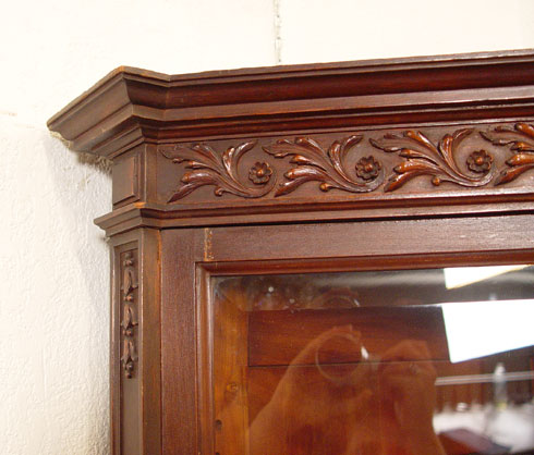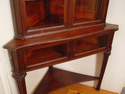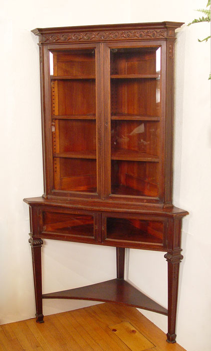 MAHOGANY HORNER QUALITY CORNER CUPBOARD: Carved cornice, beveled glass door. An unusual feature is the two drawers with glass fronts. Three legs joined by a shelf tier. Measures approx. 79'' high x 43'' across front x 22'' deep.