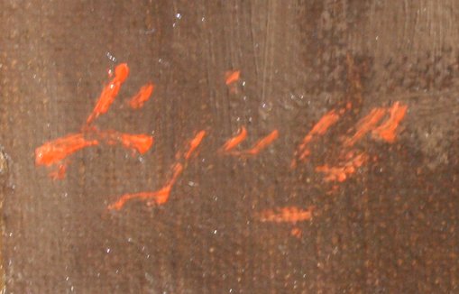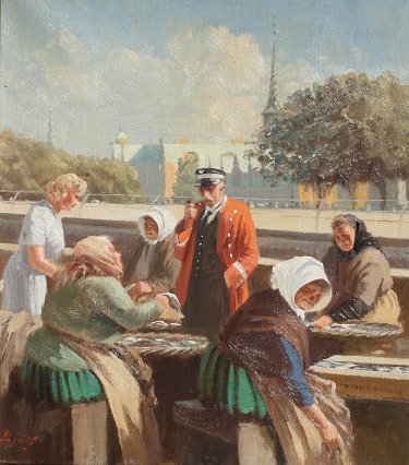 BJULF, Soren, (Danish, 1890-1958): ''Mailman at Fish Market in Copenhagen'', Oil/Canvas, 17 3/4'' x 15 3/4'', signed, encased in gilded frame with wear, 22'' x 20''.