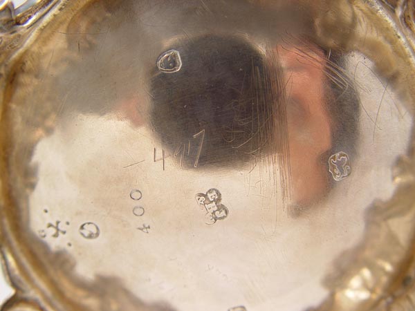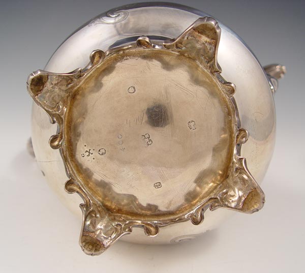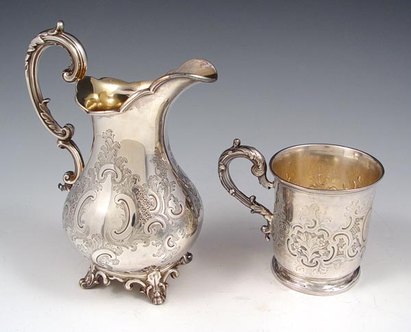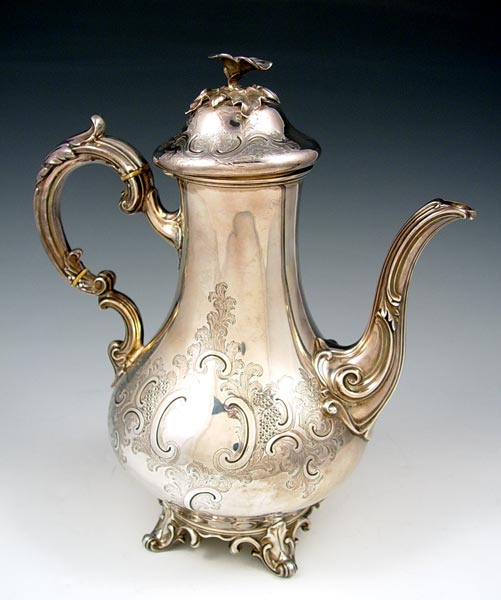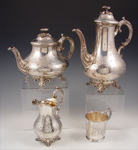 1852 BARNARD ENGLISH 4 PIECE COFFEE & TEA SET: 1852 London hallmark made by Edward & John Barnard. Engraved and repousse floral and geometric designs. Set includes 1) Coffee pot with floral finial, hinged lid Measures 11'' high x 9 1/2''. Note hinged lid does not sit correct. 2) Teapot with floral finial, hinged lid. Measures 7'' high x 10 1/2''. 3) Open creamer, measures 6 1/2'' high x 5''. Also included is 1844 London hallmark cup with repousse floral and geometric design, unknown maker JS over AS. Measures 3 1/2'' high x 4 1/4''. Approx 65.7 troy oz.