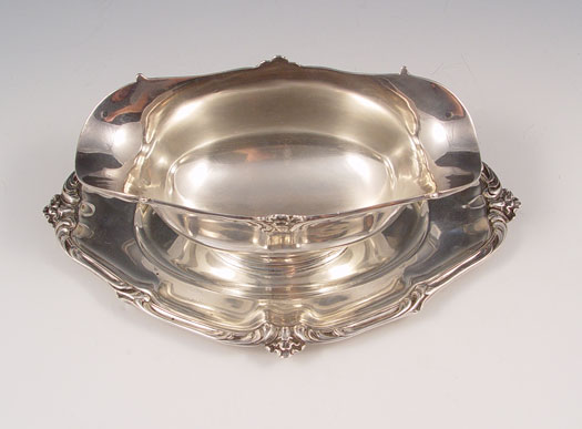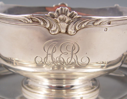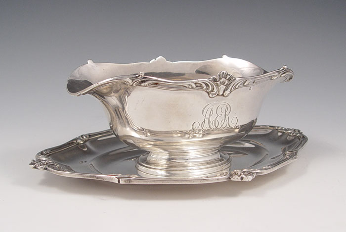 FRENCH FINE SILVER SAUCE BOAT: French .950 silver guarantee hallmark with unknown maker A.I. with heron hallmark. Monogrammed, measures 2 3/8'' high x 10 1/2'' x 7''. Approx 17.8 troy oz.