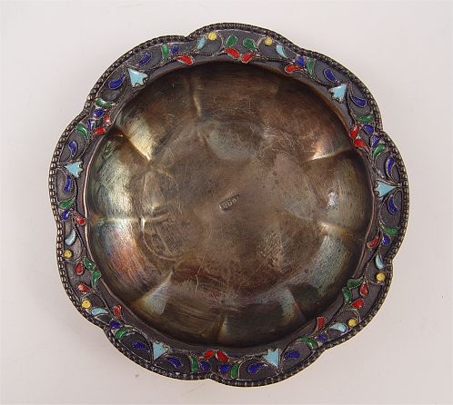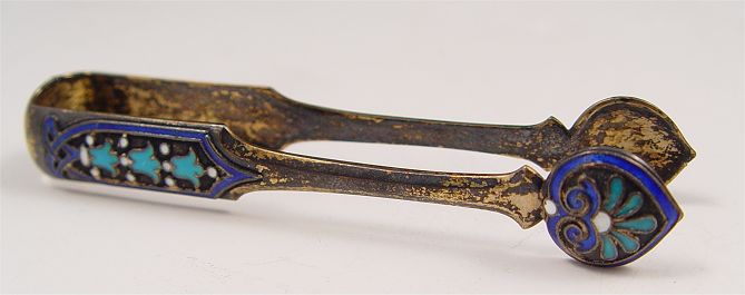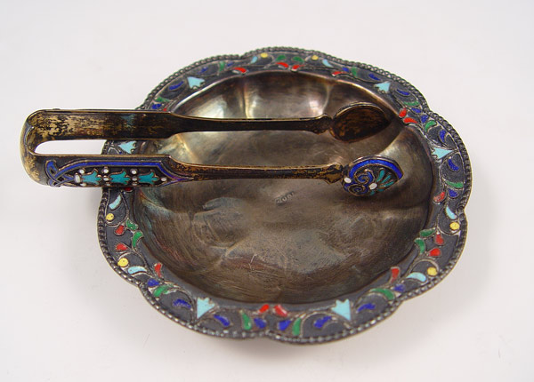 RUSSIAN ENAMEL SILVER TONGS & ENAMEL SALT: To include 1) Antip Kuzichyev Moscow enameled tongs, vermeil finish, note finish. 88 zolotnik mark. Measures 3 1/4'' long. 2) Enameled salt dish on 3 ball feet, unknown maker, partial hallmark. Unknown metal content. Measures 1/2'' high x 3 1/4'' dia.