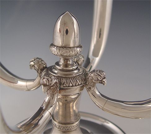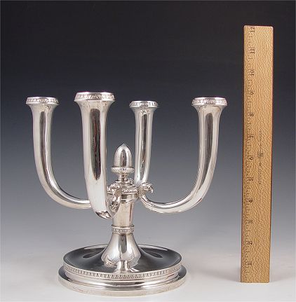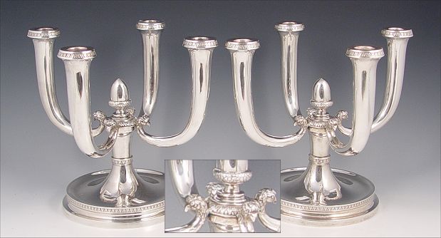 PAIR ART DECO ITALIAN STERLING CANDELABRA: Cast eagle head decoration on each of 4 holders. Stamped on base Made in Italy, unknown import hallmark and 925 sterling. Stick portion is weighted, base is not. measures 8 3/4'' high x 10'' dia.