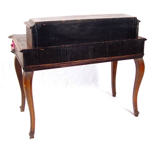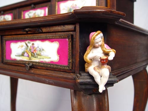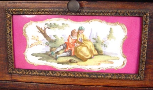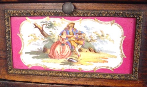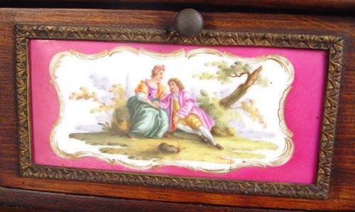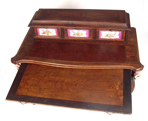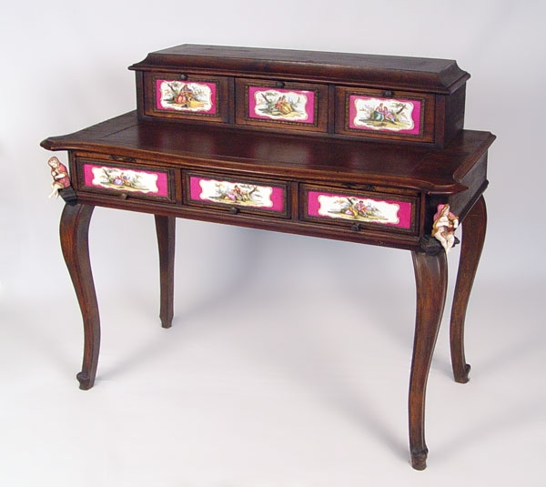 EARLY TO MID 20TH C FRENCH WRITING DESK: Sevres quality hand painted plaques on each of the five drawers, porcelain putti figures at the top of the cabriole legs. Pull out writing extension. Measures 36 1/2'' h x 43 1/2'' w x 25'' deep.