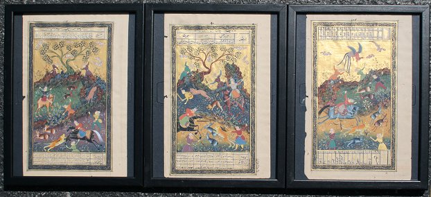 THREE PERSIAN GOUACHES DEPICTING HUNTING SCENES: With Arabic inscriptions verso, over page size 12 3/4'' x 8 1/4'', encased in matching black frames, 14'' x 11''.
