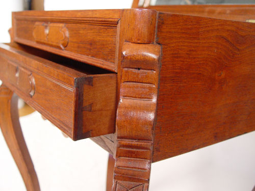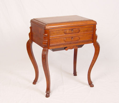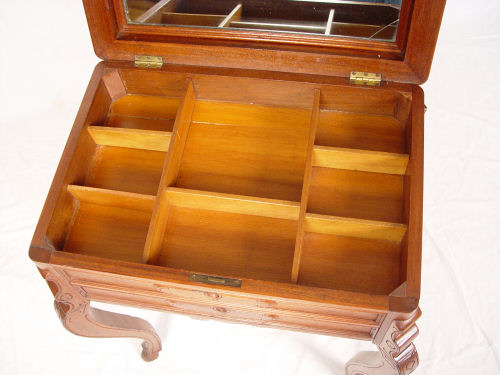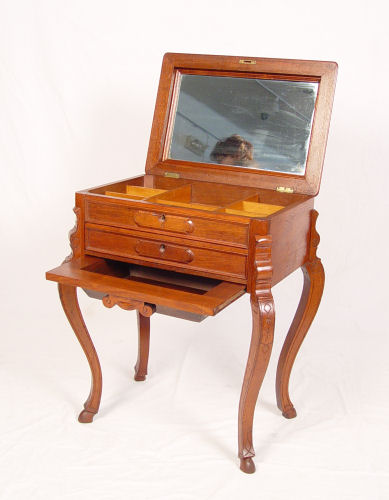 FRENCH VICTORIAN DRESSING OR WORK TABLE: Circa 1875, lift top stand, compartmented interior with mirror, storage drawer.