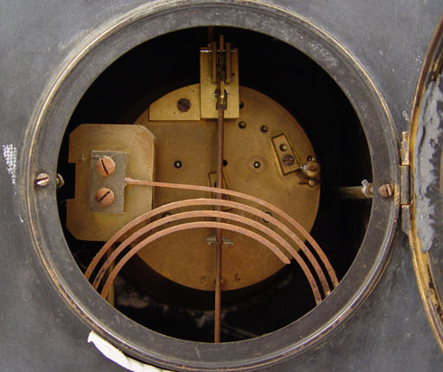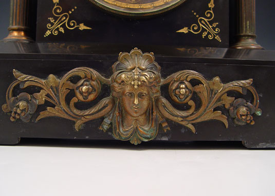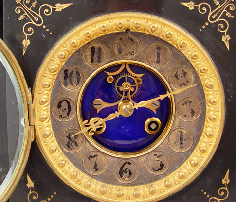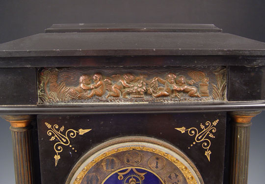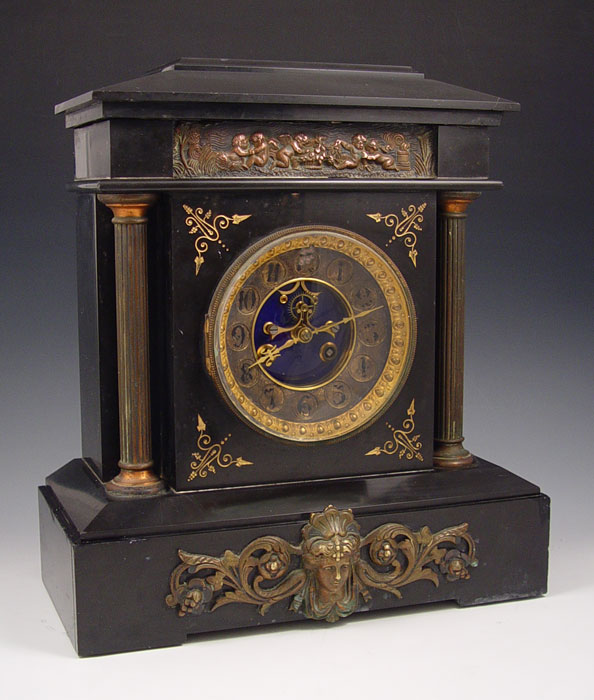 BLACK MARBLE AND BRASS MANTLE CLOCK: Heavy black marble with brass columns, cherub plaque and masqueron. Open escapement with enamel blue background, Arabic numbers. Movement unmarked as to maker. No key. Measures 15'' high x 13 1/2'' x 6 1/4''.