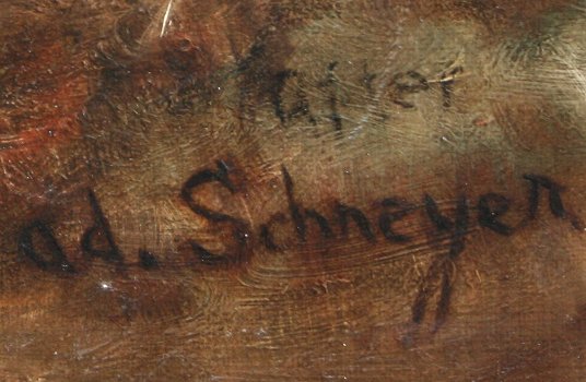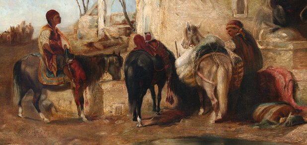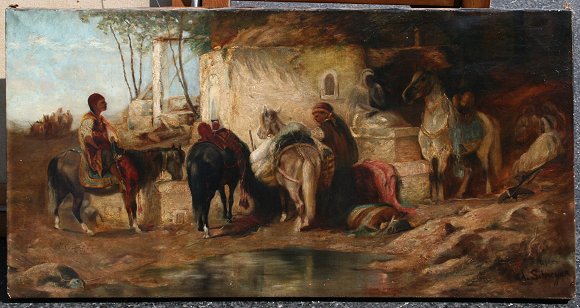 19th C OIL/C ORIENTALIST SCENE WITH FIGURES AFTER SCHREYER: Depicting travelers with horses at rest in a Middle Eastern landscape, 17'' x 34'', signed lower right ''after Ad. Schreyer'', unframed.