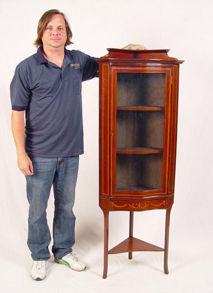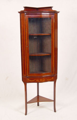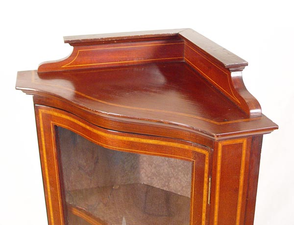 DIMINUTIVE MAHOGANY INLAY CORNER CUPBOARD: Measures 61'' high x 22 1/2'' x 14 1/2''