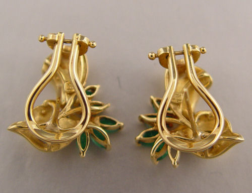 18K DIAMOND & EMERALD EARRINGS: 18K yellow gold earrings contain 6 round full cut diamonds, approx .05 Ct., and 11 marquise cut emeralds (one is missing - three are broken) Weight: .50 Ct. Approx. The stones are prong set. Post and hinged clip closures. Weight: 6.9 grams.