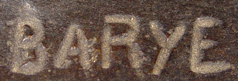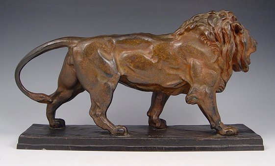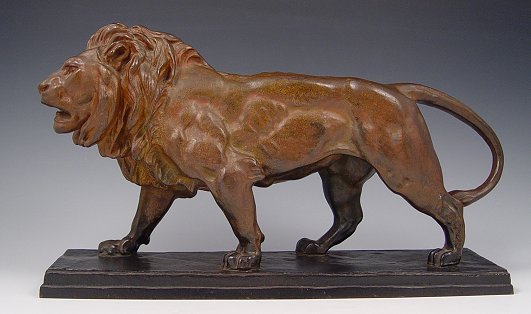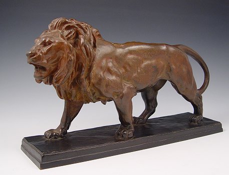 PATINATED BRONZE LION AFTER BARYE: Cast by The Henry Bonnard-Bronze Co. Founders, N.Y., 1901, incised signatures, 8'' h., 15'' w.
