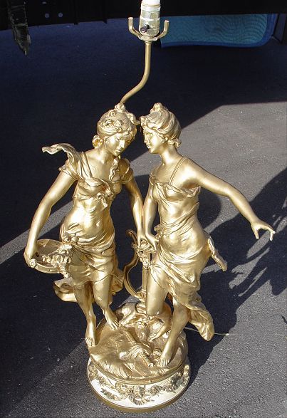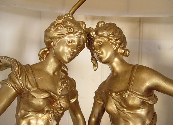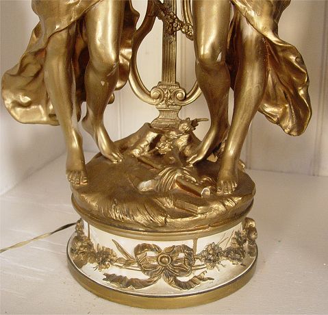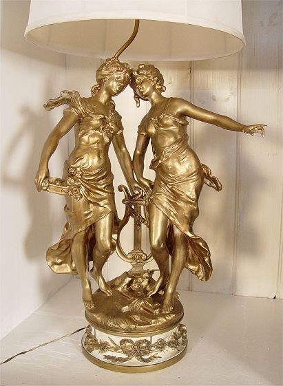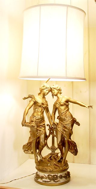 ART NOUVEAU FIGURAL LAMP AFTER AUGUSTE MOREAU ''ALLEGORY OF MUSIC'': 25'' h., 46'' with cloth shade, incised signature, Collection Francaise plaque affixed.
