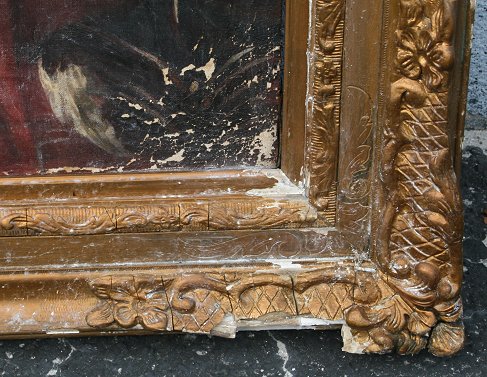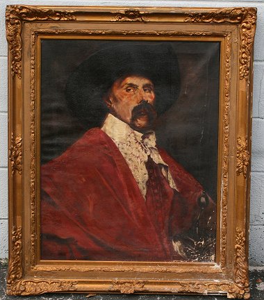 LARGE OIL/CANVAS OF CAVALIER IN THE STYLE OF ANDREIS: 31'' x 25 1/2'', unsigned, carved and gilded gesso frame with wear, repair and missing gesso, 41'' x 34''.
