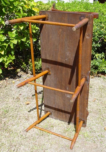 ANTIQUE COUNTRY SHERATON BENCH: Shaped top rail, straight center rail over spindles, plank seat, scroll hand holds. 53'' long x 35'' x 21''.
