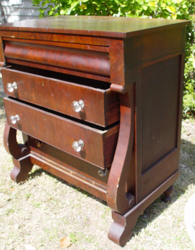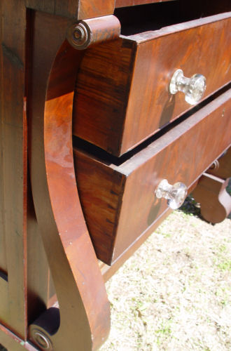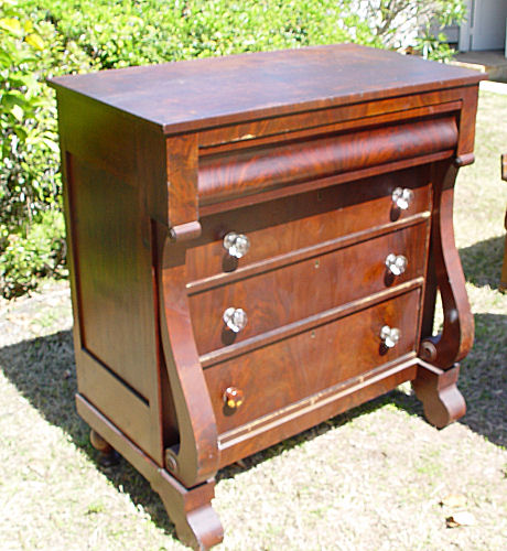 EMPIRE PERIOD MAHOGANY CHEST OF DRAWERS: Four graduating drawers, with the top being an ogee, lower three with large glass pulls. Exaggerated scroll columnar stiles. Please note some veneer loss. 48''h. x 43 3/4'' w. x 24''.