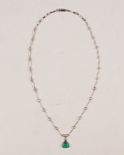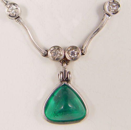 18K DIAMOND WITH A 3 CT EMERALD CABOCHON NECKLACE: 18K white wavy link necklace contains 30 round brilliant cut diamonds, approx. total weight .50 Ct. The diamonds average S1-I1 in clarity and H-I in color. The necklace features a single triangular 3 Ct. cabochon emerald, rated VS in clarity (Type II), slbG in hue, 5 tone and 4 in saturation. The diamonds are bezel and knife set. Locking closure with figure 8 safety clasp. Weight: 14.4 grams. Length 16 inches.