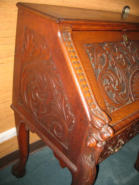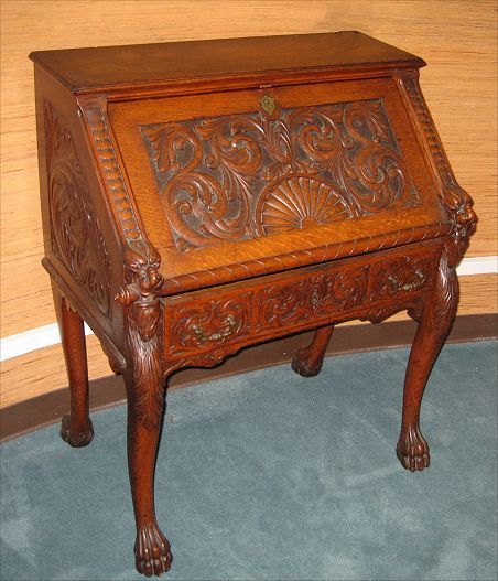 FABULOUS CARVED OAK SLANT FRONT DESK: Relief carved fall front, sides, and drawer. Full length drawer flanked by lions heads. Fancy paw feet. Measures 39'' high x 34'' x 21''