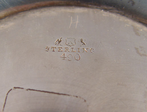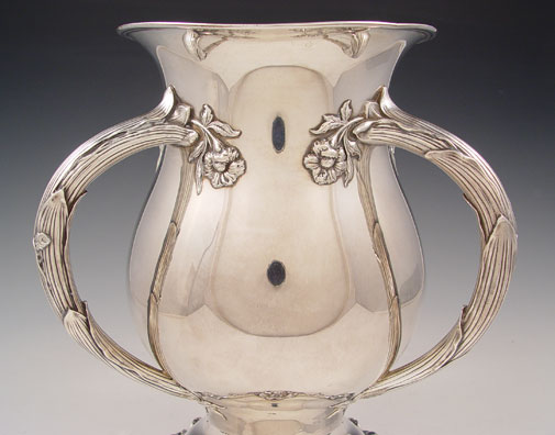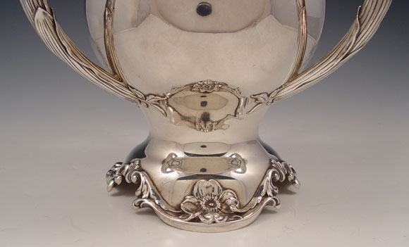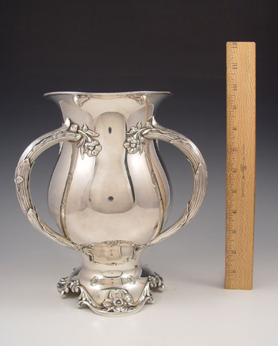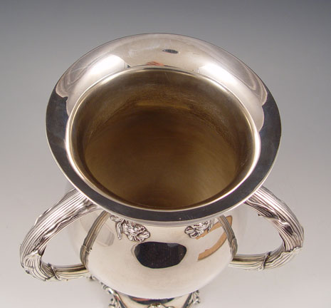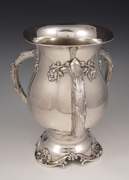 REED & BARTON STERLING CHAMPAGNE COOLER: Loving cup form with tri handle leaf and floral motif. Pattern number 490. Measures 9 1/2'' high x 8 1/2'' overall dia. Approx 41.4 troy oz.