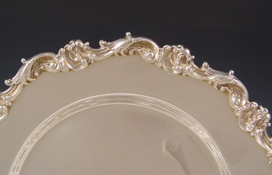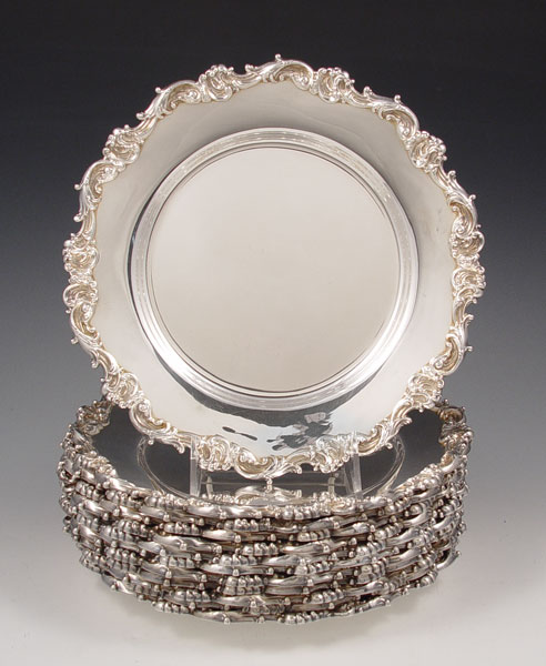 12 WHITING STERLING CHARGERS: Scroll design rims. Each charger / plate measures 10'' dia. No monograms. Approx. 168.2 troy oz.