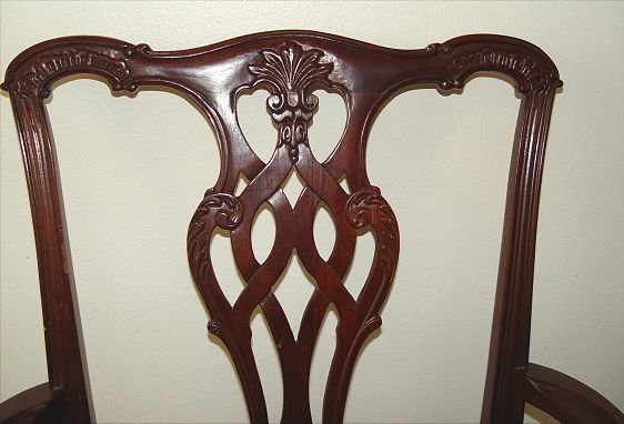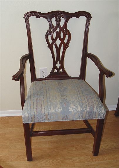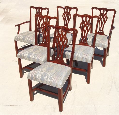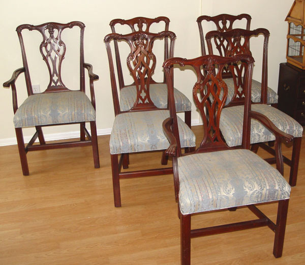 SET OF 6 ETHAN ALLEN CHIPPENDALE STYLE MAHOGANY DINING CHAIRS: 2 arm chairs, 4 side chairs. Pierce carved backs, blue damask covered straight front seats over straight legs. 39 1/4''h. x 18'', the arm chairs are 26'' wide overall.