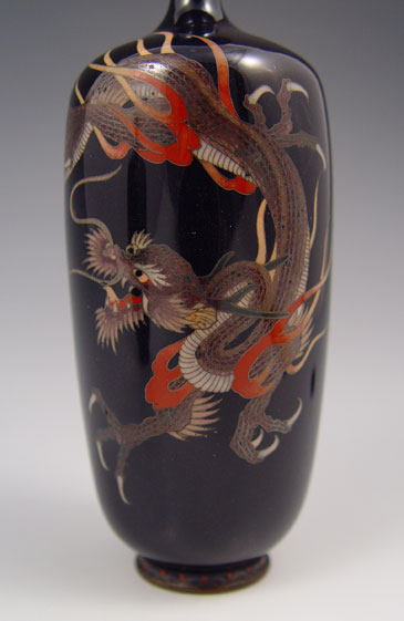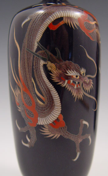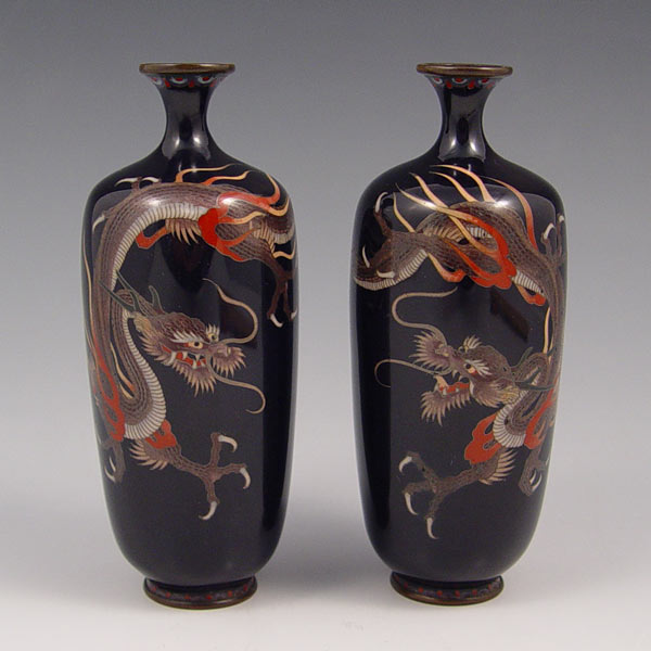 PAIR CLOISONNE BLACK VASES: Dragon design on black ground, 5'' tall, unidentified makers stamp.