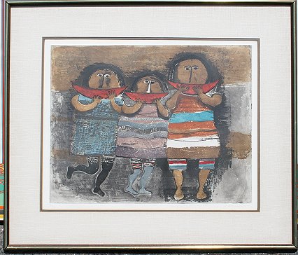 BOULANGER, Graciela Rodo, (Bolivia, 1935-): Three Children eating watermelon, Etching, sight size 19 1/2'' x 25'', pencil signed lower right, #74/100 lower left, encased in wood frame with metal trim, 29'' x 34''.