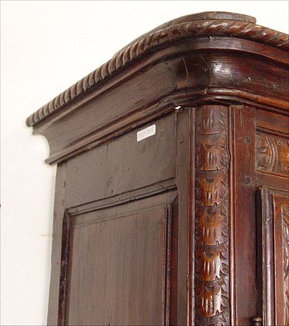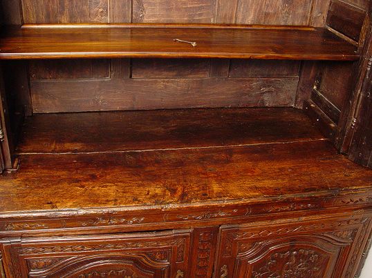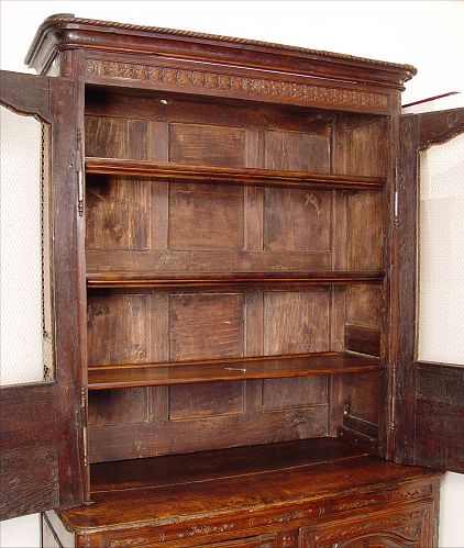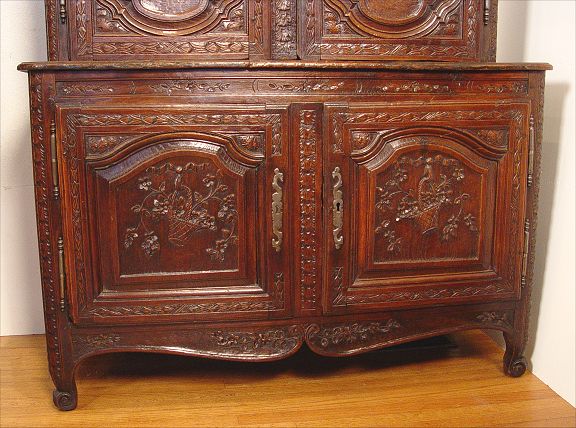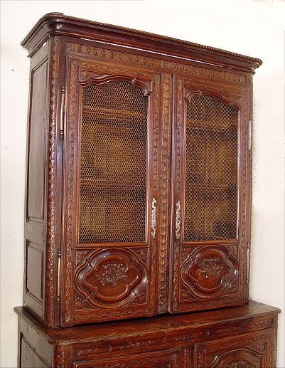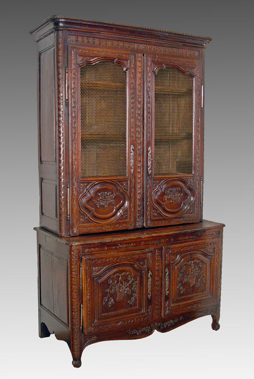 18TH C LOUIS XV NORMANDY CUPBOARD: Walnut two piece cupboard. Base cabinet of two doors and upper section with wire mesh doors. All four doors carved in a floral basket design. Removable cornice. Later added shelving. Approx. 93'' tall, the base is 26 1/2'' deep x 54 1/2'' wide.
