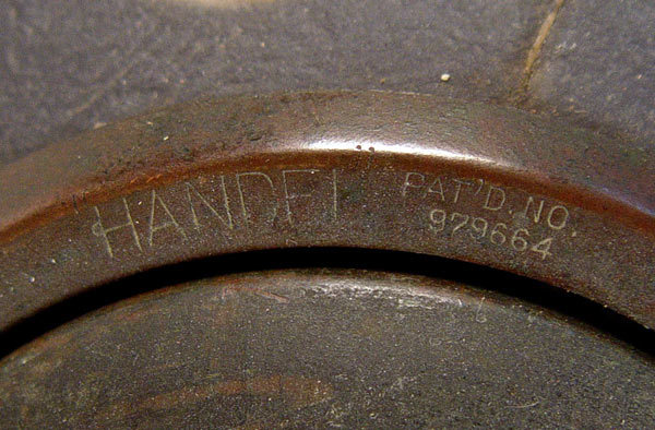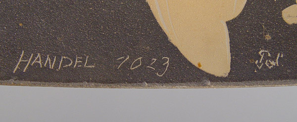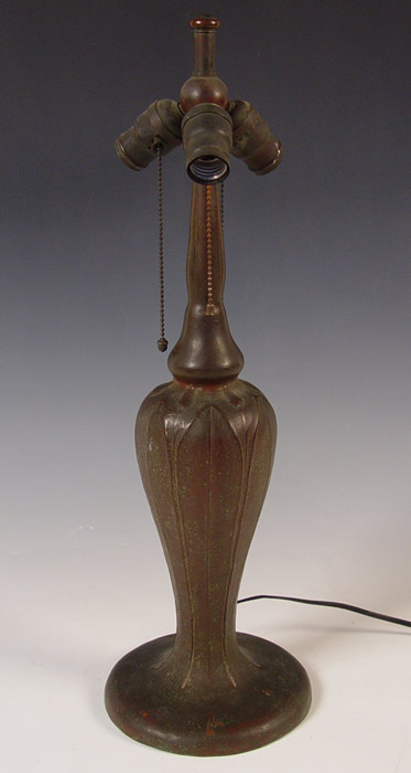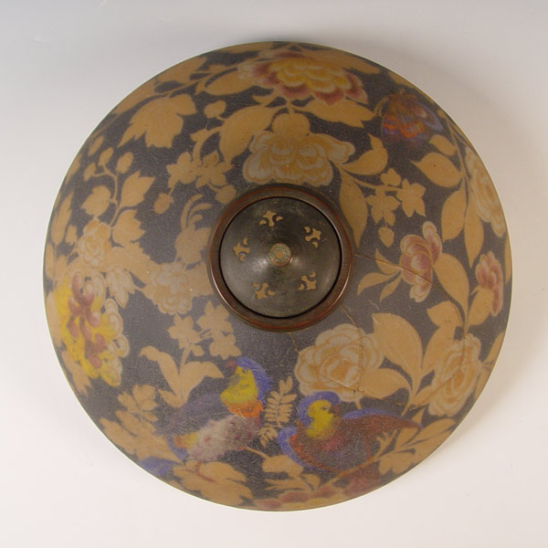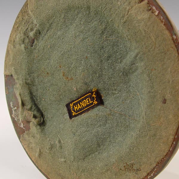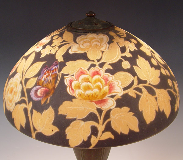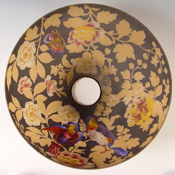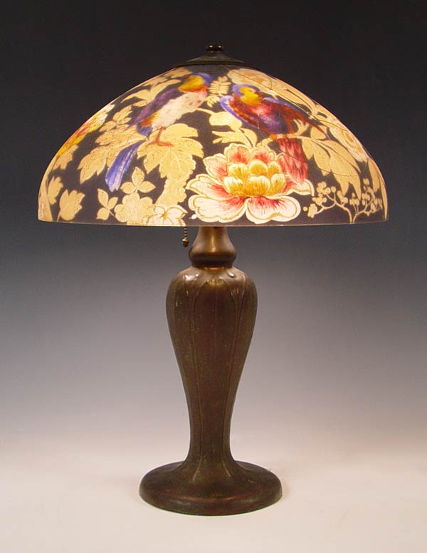 HANDEL LAMP DESIGN 7023: Domical shade in lightly chipped finish, painted in a lively parrot and butterfly amongst the blooming peonies. Signed on the metal shade rim and cloth label on the base. Acorn and tassel pull chains, 3 sockets. 18'' dia., 23'' high. Please note shade is cracked.