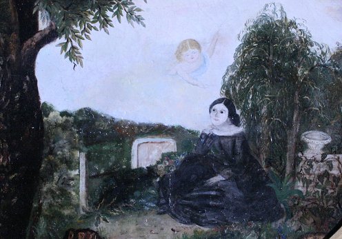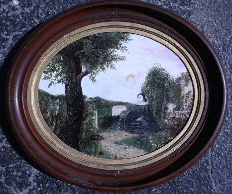 NAIVE 19TH CENTURY OIL/CANVAS CEMETERY SCENE: Angel visiting a mourning widow, 14'' x 16'' oval, ogee 19th C molding, 18'' x 22''.
