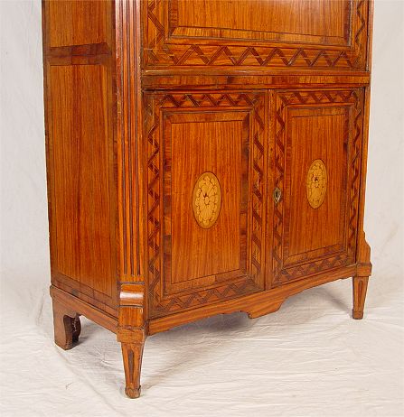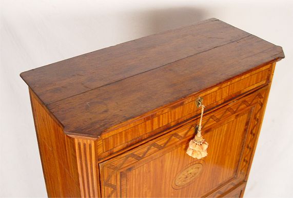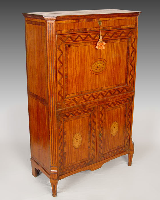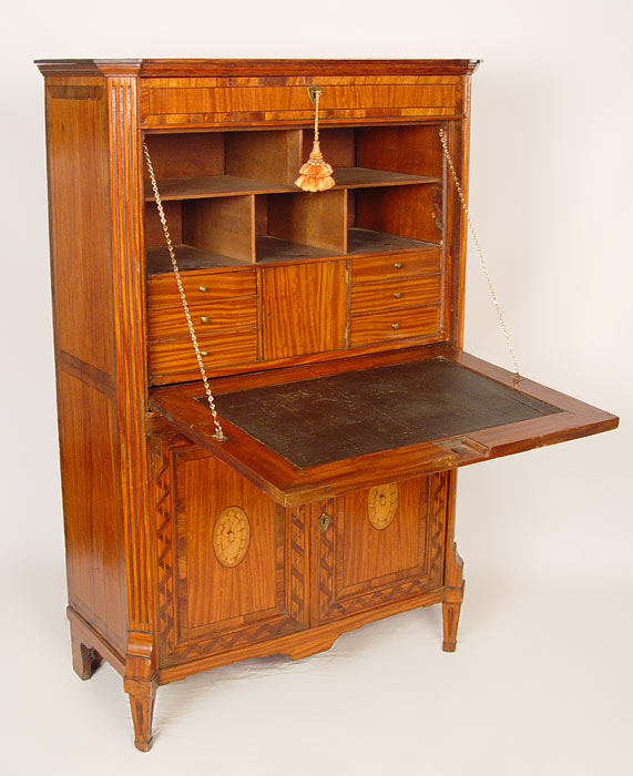 19th C MARQUETRY INLAY SECRETAIRE ABATANT: Dutch or German desk with inlay fall front. Interior with 6 drawers over a lower cabinet of two doors with shelf interior. 59'' tall x 38'' x 17 1/2'' deep.
