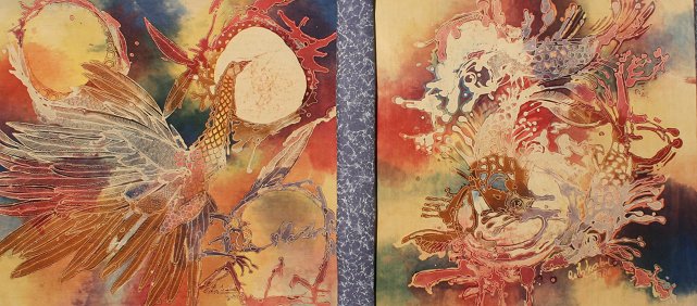 HARTONO, Wiji, (Indonesian, 20th C.): Pair of Batik Works in single frame, one of a Lionfish, and the other a wild bird, perhaps a peacock, sight size 34 1/2'' x 34 1/2'' each, overall with lighted custom display box, 41'' x 81'', signed and dated 1986.