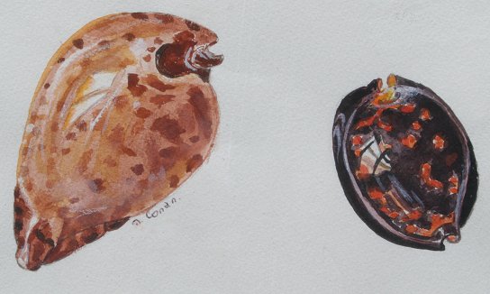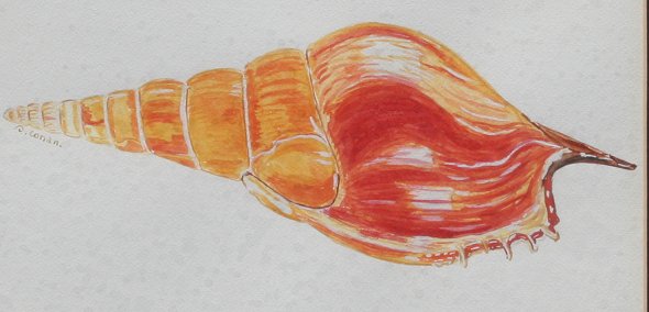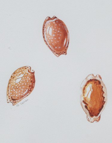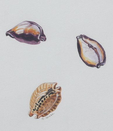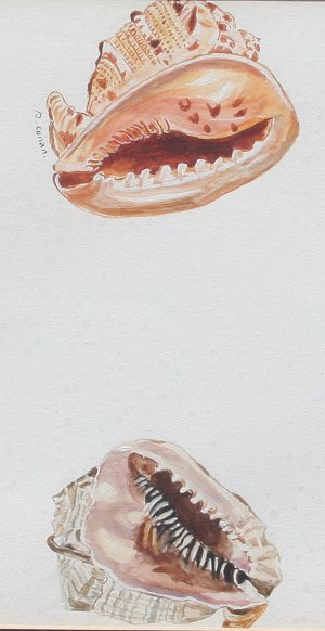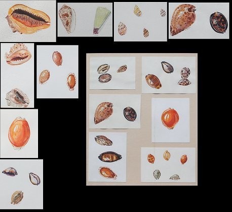 CONAN, Gildas, (Gigi), (French, 20th C.): 9 pc lot Watercolor paintings of shells, eight in matching frames, 17'' x 14'', one in black lacquer frame with wear, 21 1/2'' x 17 1/4''. Many of the pieces consist of more than one image.