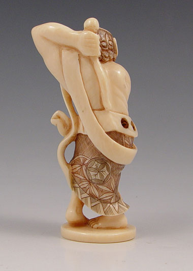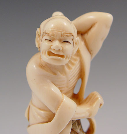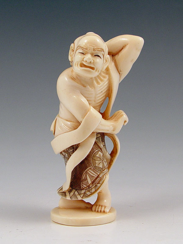 LARGE JAPANESE CARVED IVORY NETSUKE: Man reaching back to scratch his back. Signed, 3 1/2''.