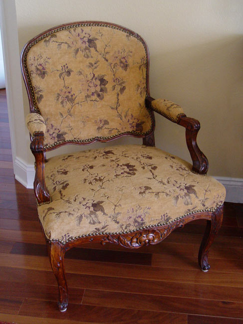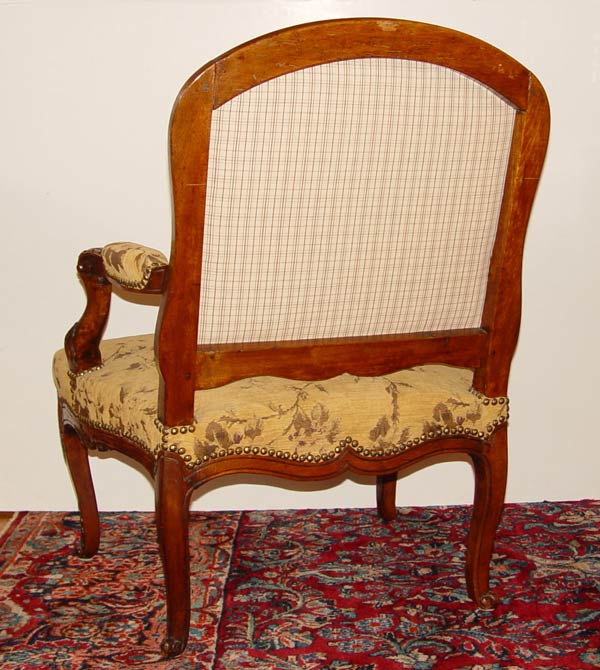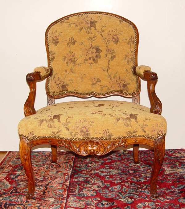 18H C FRENCH WALNUT FAUTEUIL: Cartouche shaped back and seat in later upholstery. Carved seat rail and arms. 36 1/2'' high x 27 1/2'' x 21''
