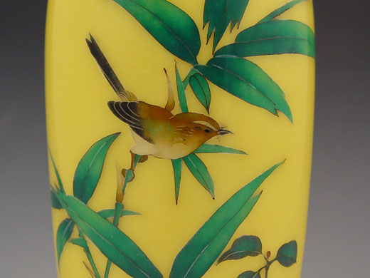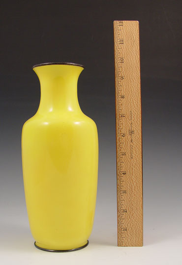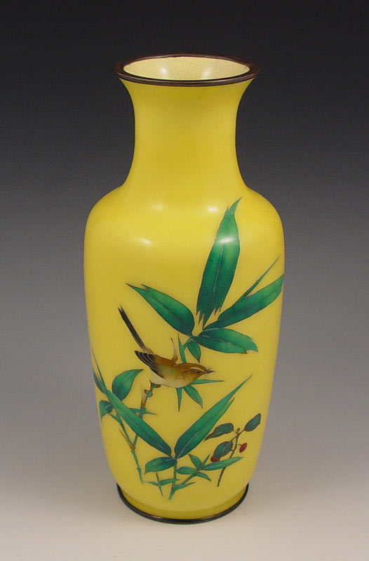 SIGNED BIRD AND BAMBOO DESIGN YELLOW CLOISONNE VASE: Silver base metal, bears the impressed mark for Ando. 9 3/4''H.