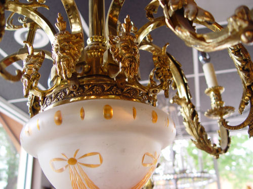 ITALIAN RENAISSANCE STYLE BRASS CHANDELIER: 9 lights with center light covered by a carved glass shade. Enhanced with acanthus leaves and masquerons. Approx. 35''h. excluding the chain, 34'' dia.