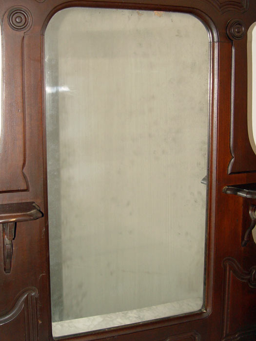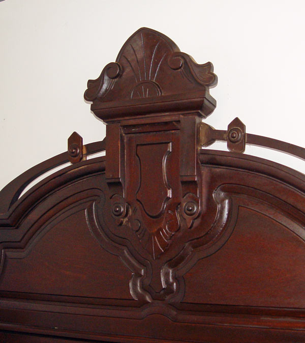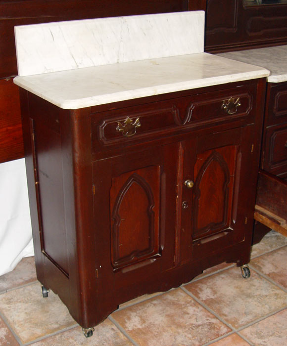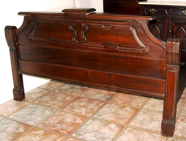 3 PIECE VICTORIAN ROCOCO REVIVAL BEDROOM SET: Heavily carved crest with open fret on the bed and the dresser, raised panels throughout. Full size BED, headboard measures 85'' h. x 58 1/2'' x 3'', footboard 34'' h. x 56 1/2'' x 3'', rails 70 3/4''. Marble top DRESSER with mirror, 85'' h. x 42 1/2'' x 18'', Marble top WASHSTAND, one drawer over 2 door on casters, measures 36 1/2'' h x 29'' x 14''. The original mirror does have silver wear and the finish could use a little TLC.