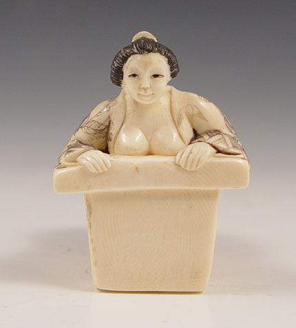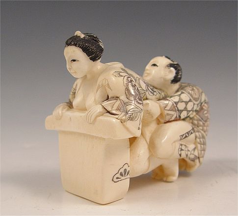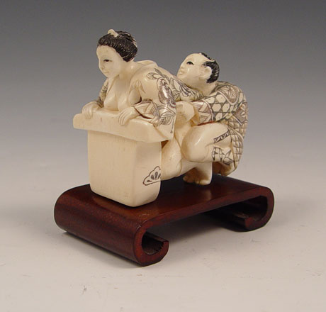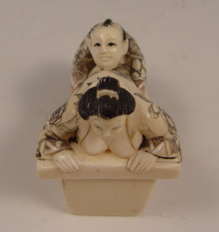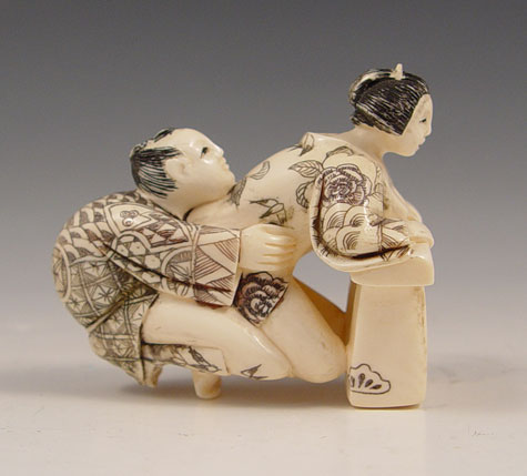 JAPANESE IVORY EROTICA OKIMONO: Two figures, measures 2 1/4'' h. x 2 1/2'' long.